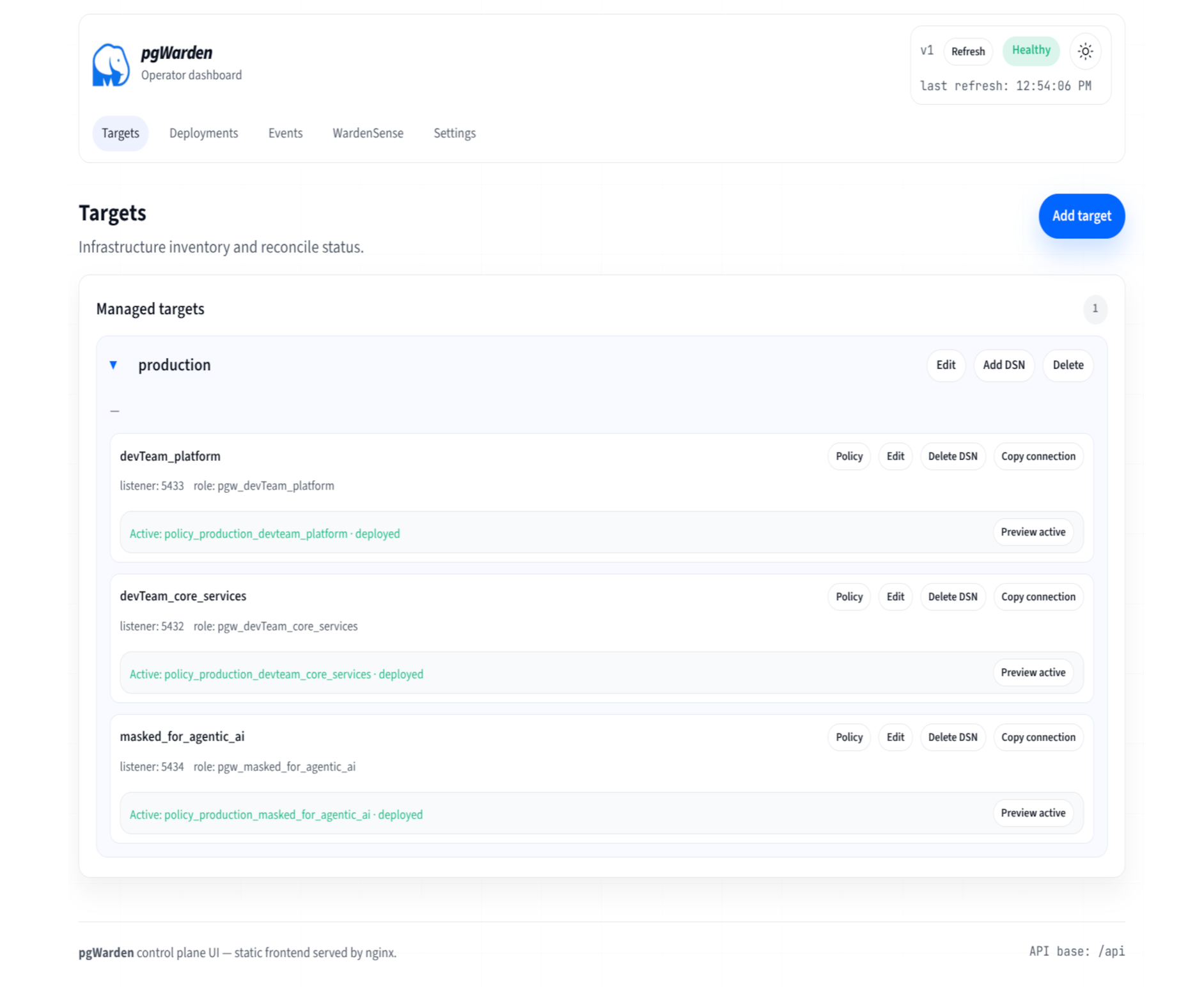 - pgWarden proxy deployed as a mostly stateless service (with last‑known‑good cache)